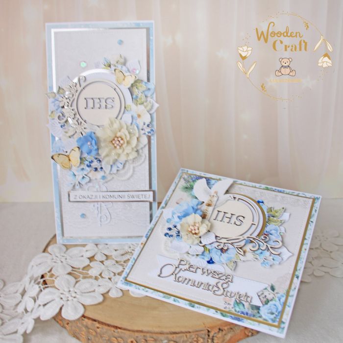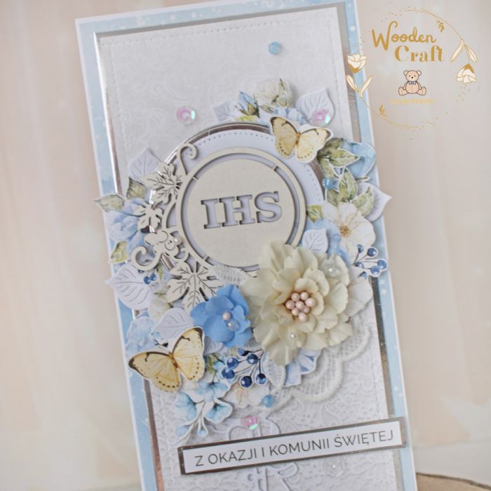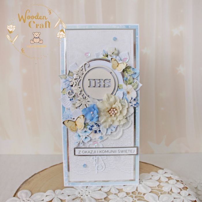 Piękna, elegancka kartka komunijna, pamiątka Pierwszej Komunii Świętej, wykonana ręcznie z najwyższą starannością, z cudownej kolekcji papierów "Sapphire Days", utrzymana w pastelowych odcieniach błękitu, kremu i bieli, z dodatkiem złotych, błyszczących akcentów. Na środku kartki umieszona została tekturka przedstawiająca hostię świętą z winoroślą, otoczoną kompozycją kwiatową, z ręcznie wykonanymi, materiałowymi kwiatami, ozdobiona motylkami oraz napisem "Z okazji Pierwszej Komunii Świętej"- do napisu mogę również dodać imię dziecka lub całkowicie zmienić go na inny.