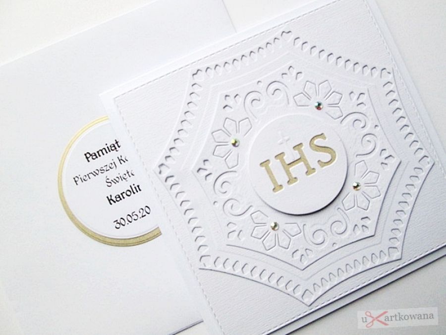 Kartka jest bardzo subtelna. Zdobią ją ażurowe wycinanki, na których umieszczona została Hostia.
