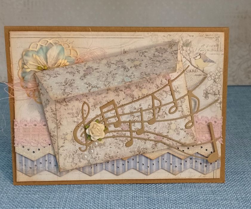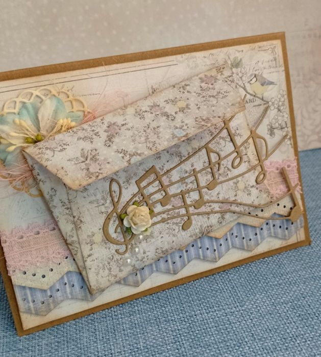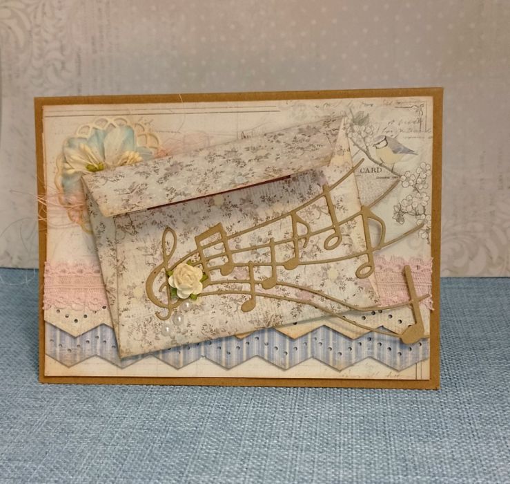 Delikatne, pastelowe kolory, mniejszy rozmiar tej kartki, sprawiają, że jest lekka w odbiorze. Dla miłośników stylu shabby chic i romantycznych klimatów. Będzie świetnym dodatkiem do prezentu, a koperta na frontowej części kartki umożliwi dołączenie bileciku lub wsunięcia banknotu.