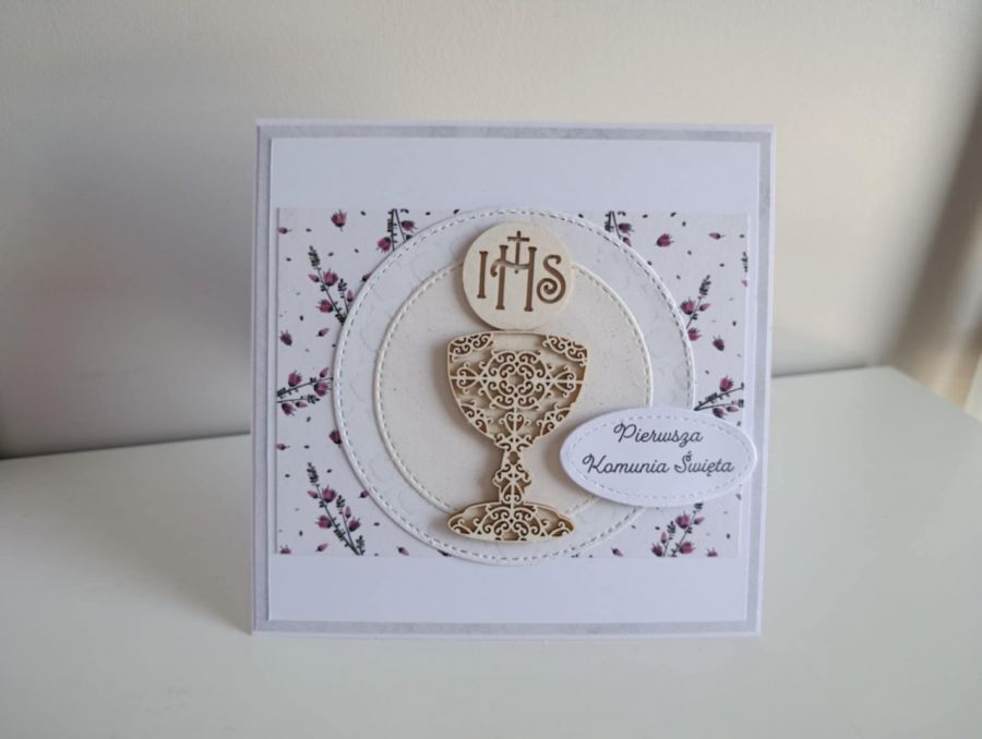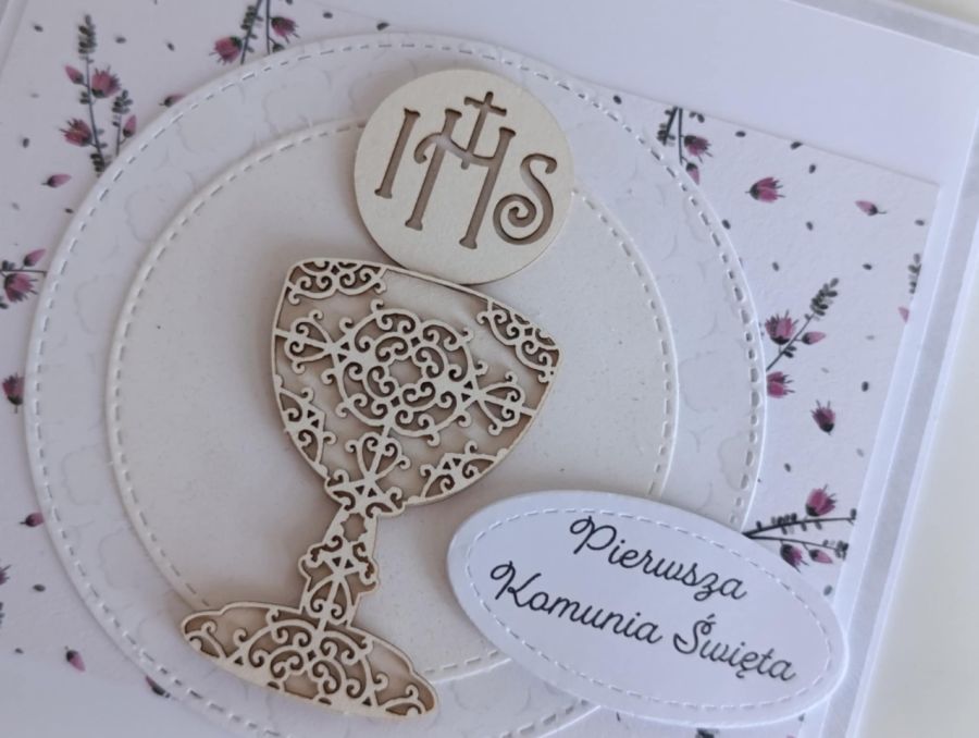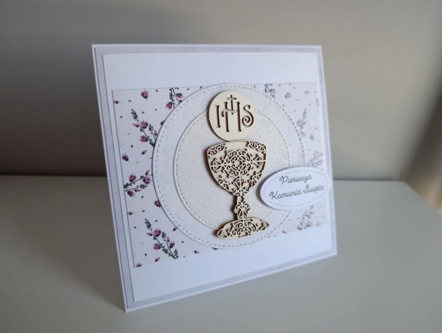Zadaj pytanie dotyczące produktu: Kartka Pierwsza Komuia Święta biała z kielichem