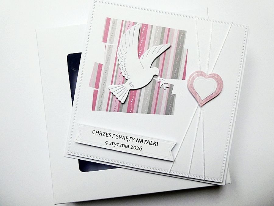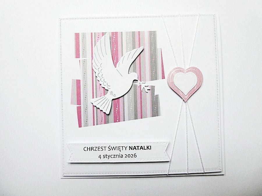 Wycięta z papieru gołebica podkreśla religijny charakter pamiatki, a ozdobny sznurek z serduszkiem dodaje kompozycji uroku.