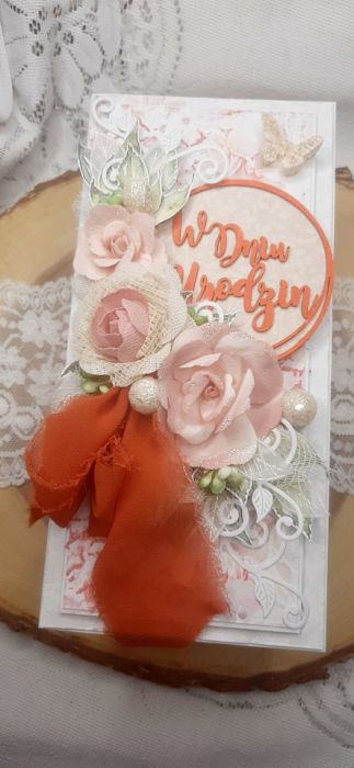 Kartka okolicznościowa do pudełka. Kartka jest bogato zdobiona kwiatami i innymi dodatkami. W środku kartka na życzenia podklejona taśmą dwustronną. Wymiary kartki 20,5x10 cm. W zestawie z pudełkiem o wymiarach 21x10,5x3 cm.