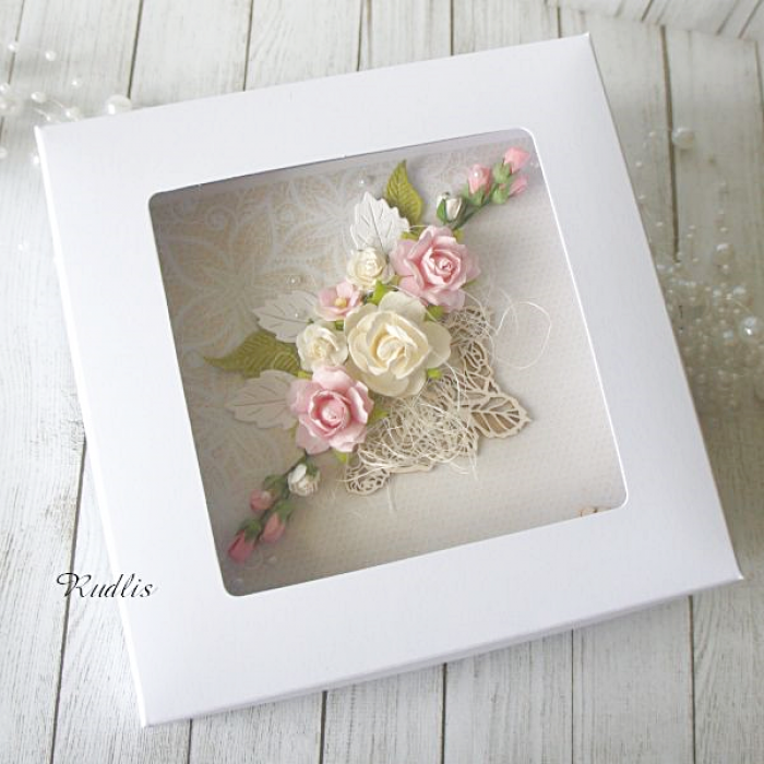 Urocza, romantyczna kartka ślubna wykonana z wykorzystaniem profesjonalnych materiałów. Kartka w komplecie z białym pudełkiem z okienkiem.