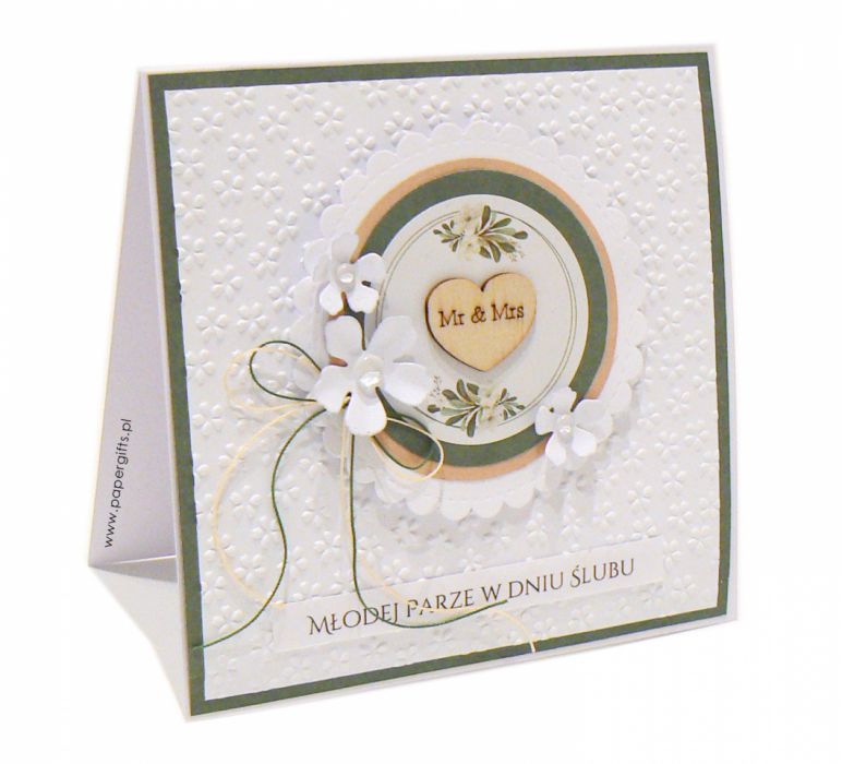 Wykonana na bazie papieru 250 g, tło z tłoczonego papieru, z delikatnymi sznureczkami, na środku ręcznie wycinane elementy, grafika z wiankiem z liści oraz drewniana wycinanka serce. W środku życzenia: W Dniu Waszego Ślubu najpiękniejsze życzenia, by każdy dzień przyniósł to wszystko co dobre i piękne w życiu, by się spełniły Wasze marzenia i zrealizowały wszystkie pragnienia.