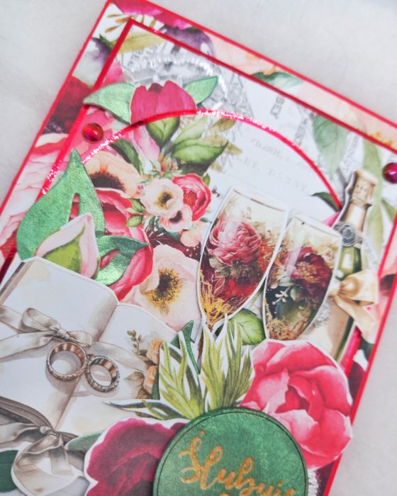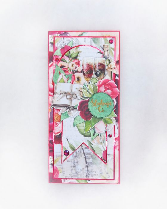 Ta ręcznie robiona kartka w kolorystyce czerwono-zielonej to idealny wybór dla osób ceniących piękno i elegancję. Klasyczna pionowa kompozycja ze złotymi akcentami i ślubnymi motywami tworzy niepowtarzalny design. Złoty napis "Ślubuje" dodaje klasy.