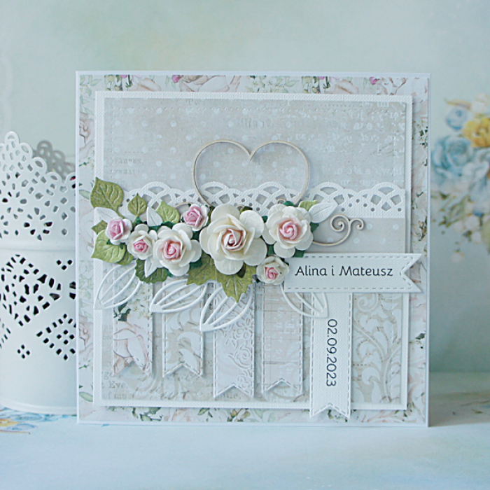 Urocza i bardzo romantyczna kartka ślubna dla wyjątkowej pary w komplecie z białym pudełkiem.