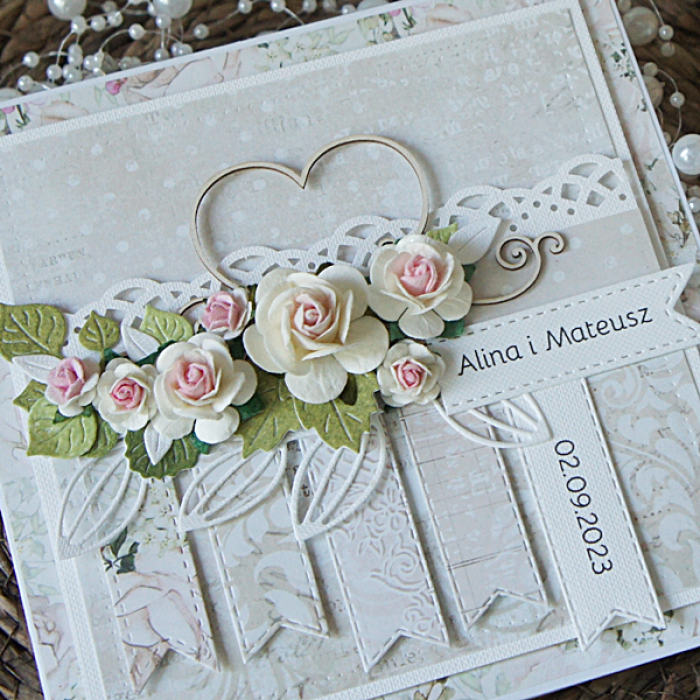 Ozdobiona pięknym, eleganckim papierem polskiego producenta, przestrzennym bukietem, tekturowym sercem oraz paseczkami.