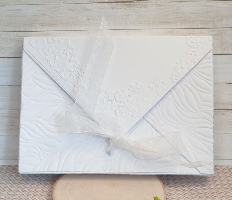 Wyjątkowa, wielowarstwowa kartka okolicznościowa, stworzona z myślą o uroczystości zaślubin. Łączy w sobie subtelną kolorystykę beżu, zieleni i bieli z misternymi detalami, tworząc pamiątkę, która przetrwa lata.