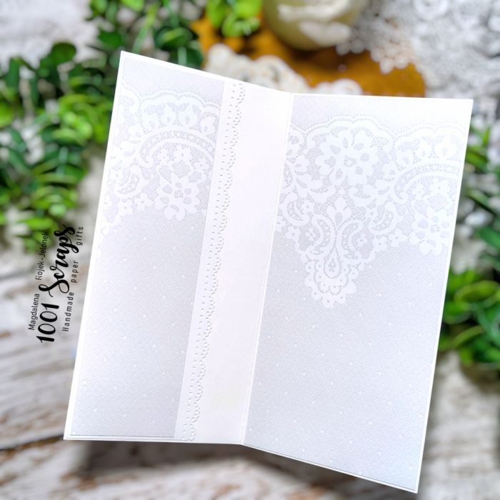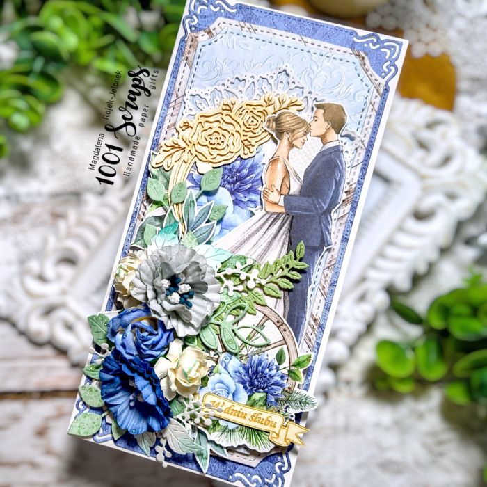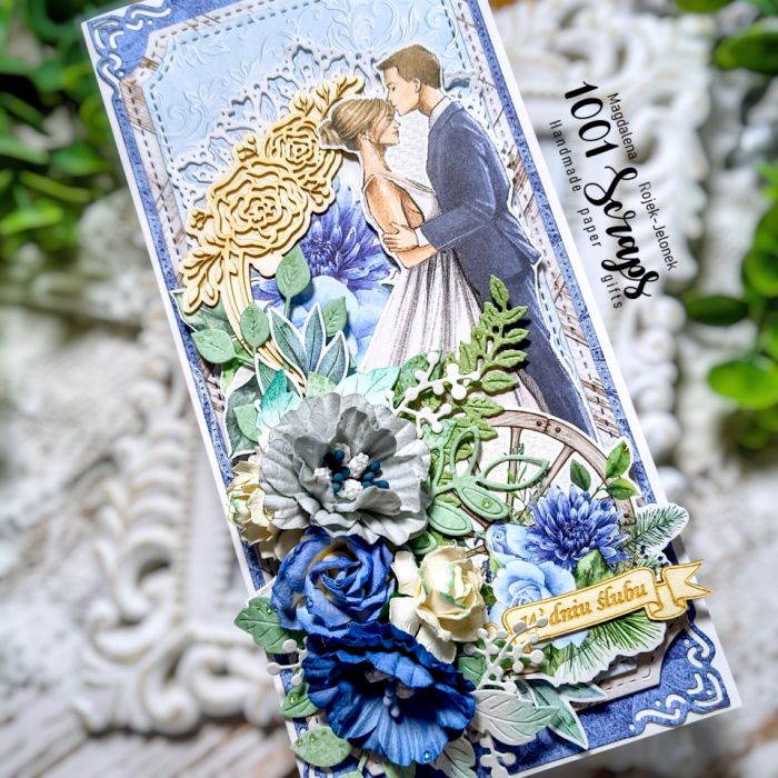 Bogato zdobiona kartka ślubna w odcieniach koloru niebieskiego. Kartka wykonana z materiałów do scrapbookingu najwyższej jakości. Bazą kartki jest biały karton 250g, oklejony papierami do scrapbookingu w delikatnych odcieniach niebieskiego i bieli. Z frontu kartkę zdobi bogata kompozycja z grafiką młodej pary. Całość uzupełniają zdobne tekturki, bogata kompozycja kwiatowa oraz napis okazjonalny. W środku karki miejsce na życzenia, które przesłane przez klienta zostaną wydrukowane i wklejone do kartki. Alternatywą jest umieszczenie białego karnetu do własnoręcznego wypisania życzeń. Po lewej stronie w środku karki kieszonka na banknot lub kupon. Kartka pakowana do białego pudełeczka z tzw. okienkiem.
