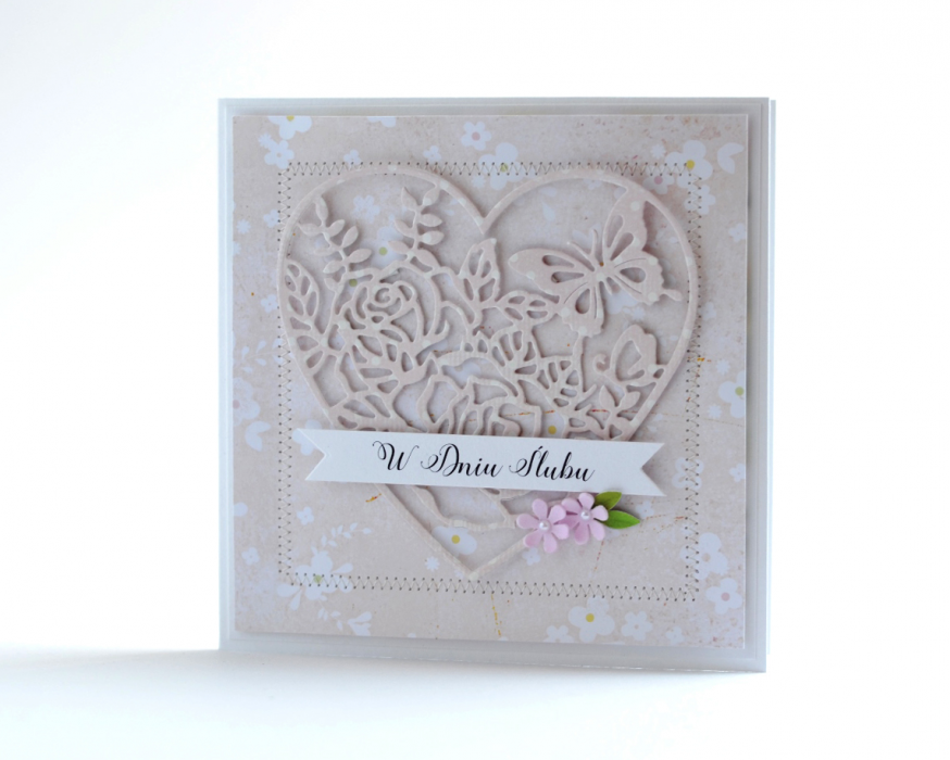 Pastelowa kartka ślubna ozdobiona dużym ażurowym sercem.