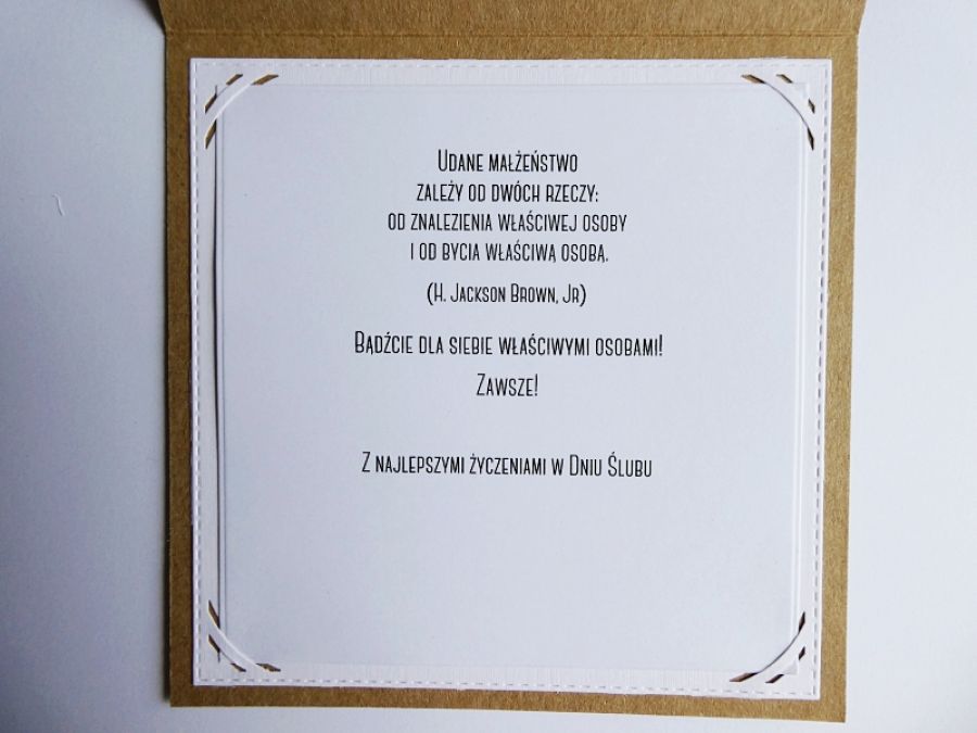 Ślubny charakter kartki podkreśla wycięte z papieru serduszko, a starannie dobrane słowa na pewno trafią prosto do serca obdarowanych nowożeńców.