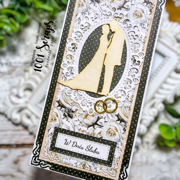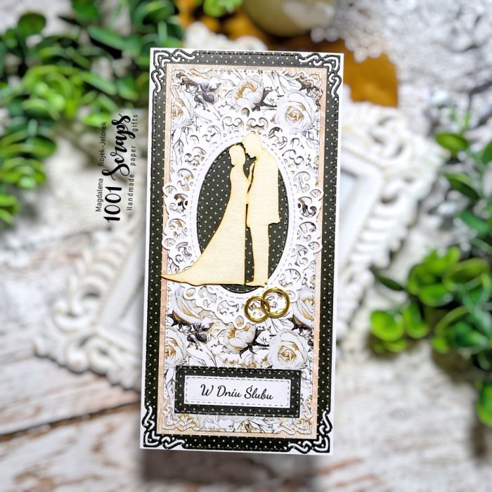 Kartka w formacie DL mieszcząca się do koperty (dołączona do kartki). Kartka ozdobiona papierem scrapowym najwyższej jakości oraz tekturka z wizerunkiem pary młodej i obrączkami. Kartka oklejona jest również w środku i z tyłu. W środku miejsce na wklejenie życzeń.