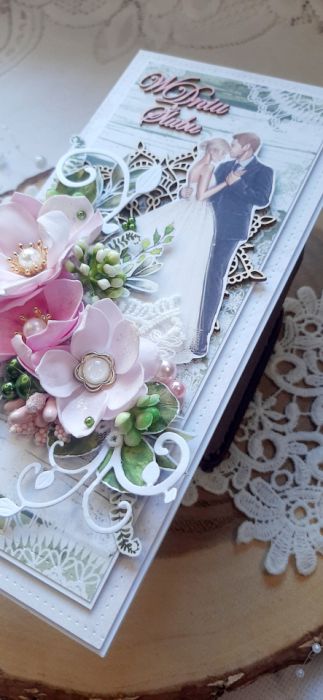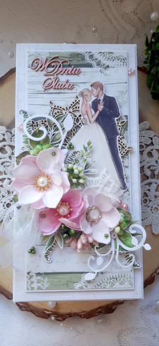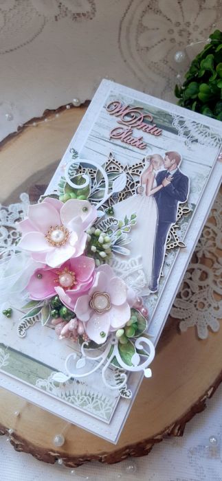 Kartka okolicznościowa do pudełka. Kartka jest bogato zdobiona kwiatami i innymi dodatkami. W środku kartka na życzenia podklejona taśmą dwustronną. Wymiary kartki 20,5x10 cm. W zestawie z pudełkiem o wymiarach 21x10,5x3 cm.