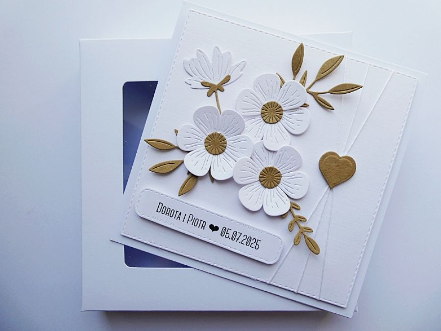 Na froncie znajduje się banerek z imionami Pary Młodej i datą uroczystości, a wewnątrz - piękne życzenia.