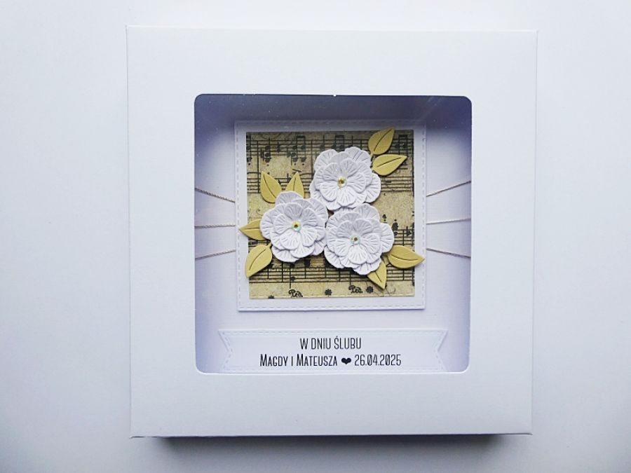Ręcznie wykonane białe kwiaty dodają pamiątce lekkości i elegancji.