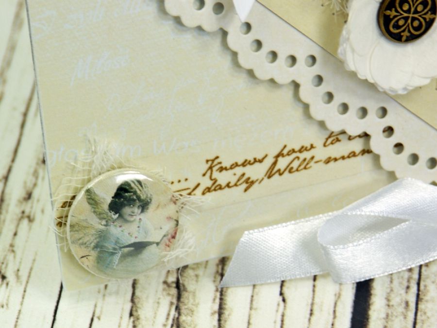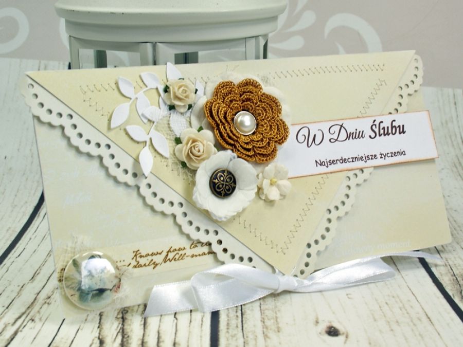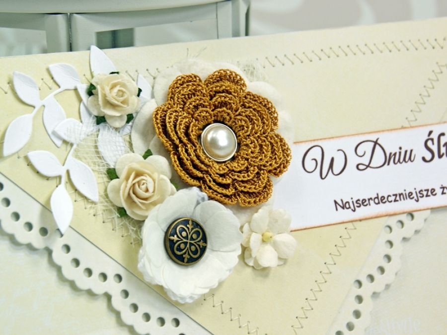 Elegancka kartka kopertówka wykonana z wysokiej jakości papierów do scrapbookingu, obszywana maszynowo. Kartka zdobiona kwiatami- papierowymi oraz szydełkowym. W środku wkładka na życzenia z cytatem.
