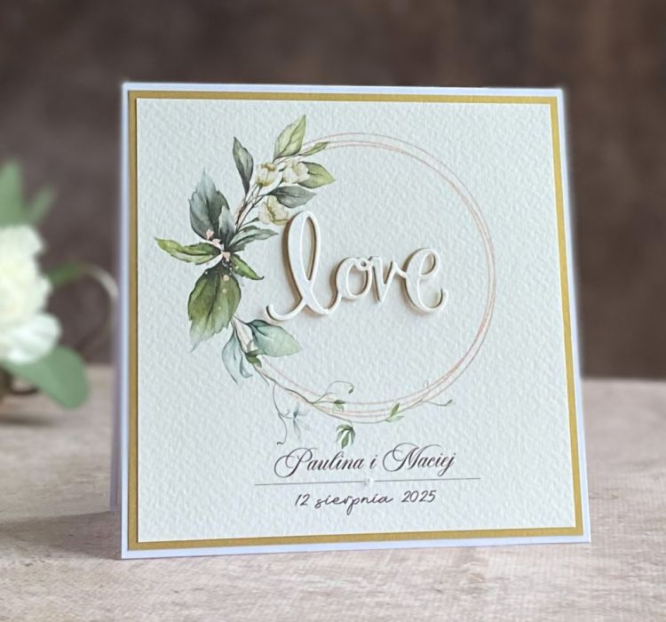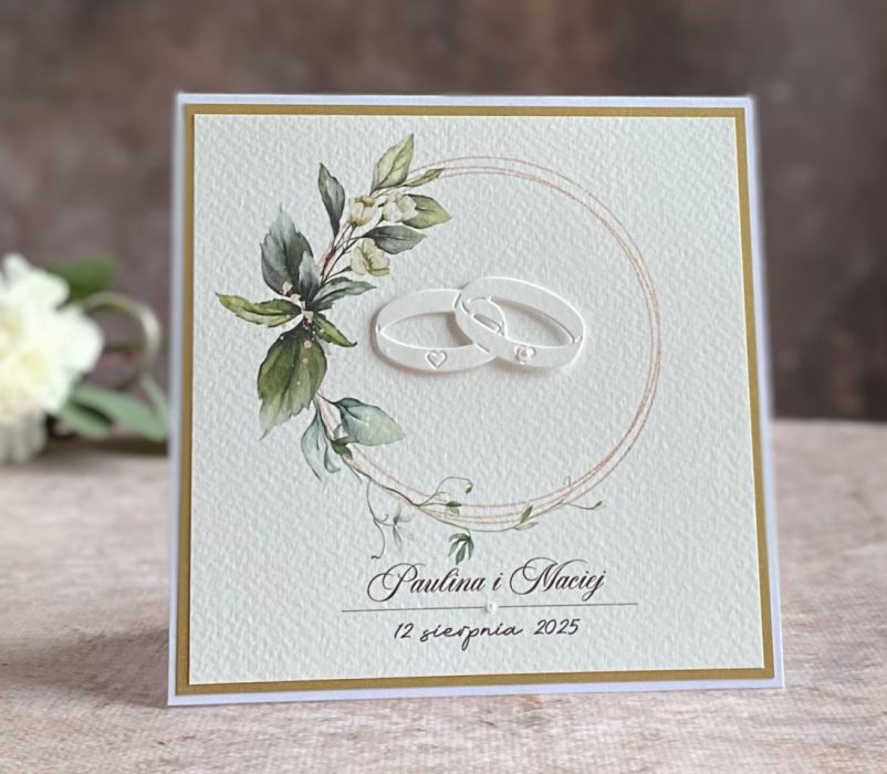 Elegancka, ręcznie wykonana, personalizowana kartka z okazji ślubu w ozdobnej kopercie.