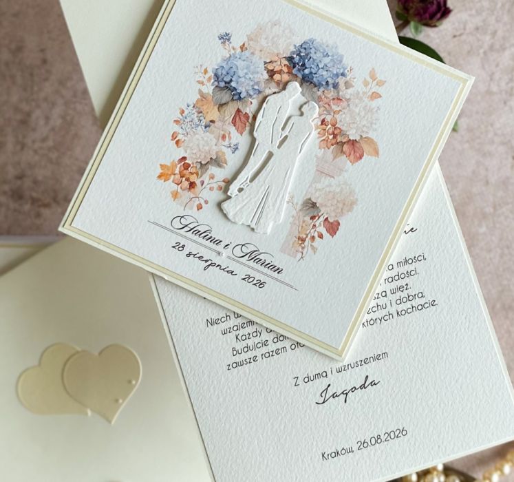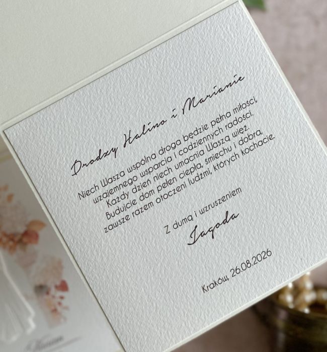 To zestawienie wyjątkowego włoskiego papieru w odcieniu delikatnej, śmietankowej bieli oraz wykończeń w odcieniu ecru. Ozdobionych ręcznie wyciętymi elementami z dodatkiem alabastrowych perełek lub delikatnych cyrkonii.
