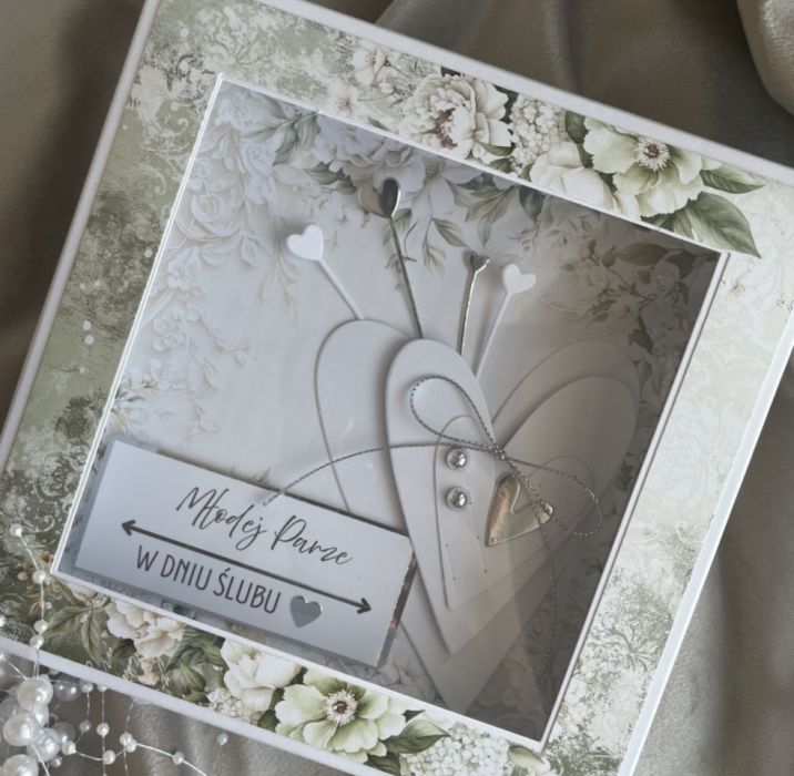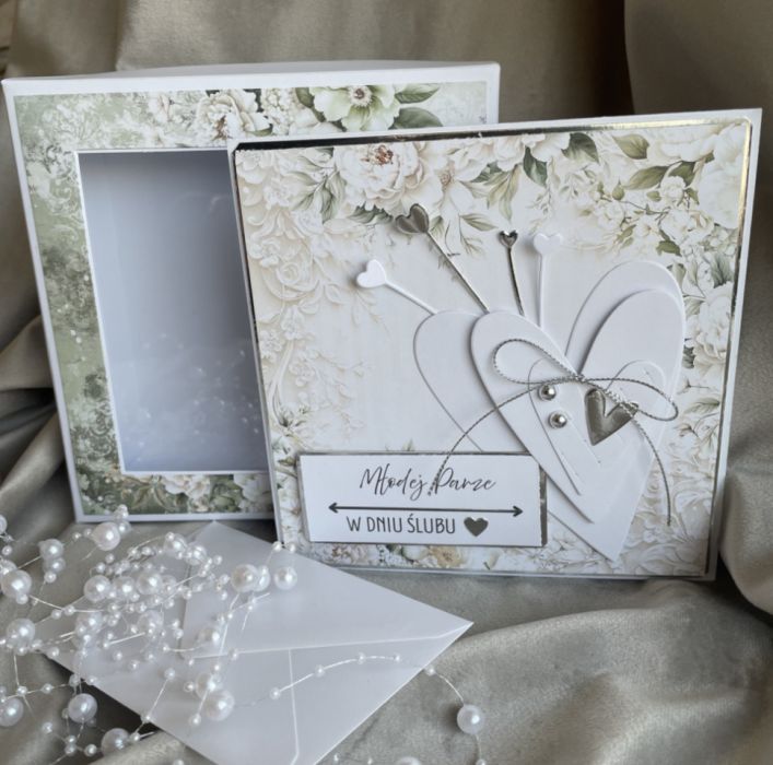 To piękna, ponadczasowa pamiątka dla Młodej Pary. Kartka zapakowana jest w dekoracyjne pudełko z okienkiem, które pozwala wyeksponować jej detale już