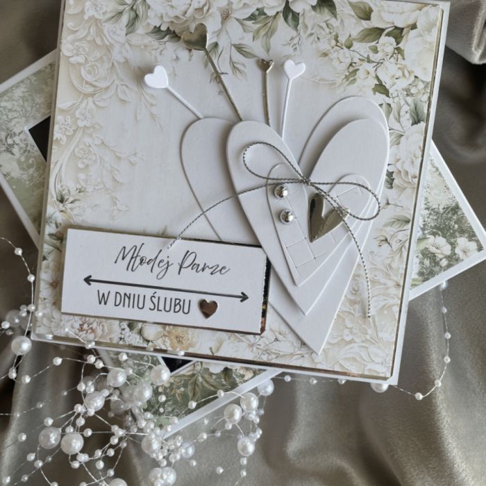 Wyjątkowa, ręcznie wykonana kartka ślubna utrzymana w eleganckiej kompozycji bieli, motywów kwiatowych oraz lustrzanych, srebrnych elementów, które dodają całości blasku i nowoczesnego charakteru.