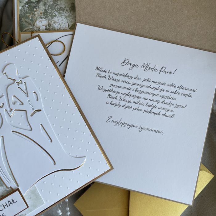 Kartkę ślubną z gotowymi życzeniami, utrzymaną w delikatnej, romantycznej stylistyce.