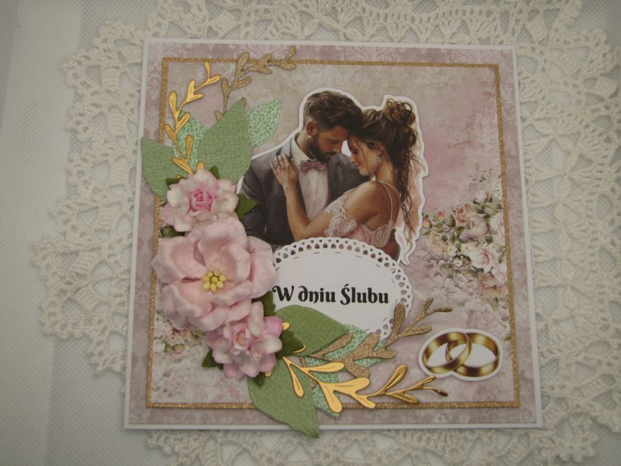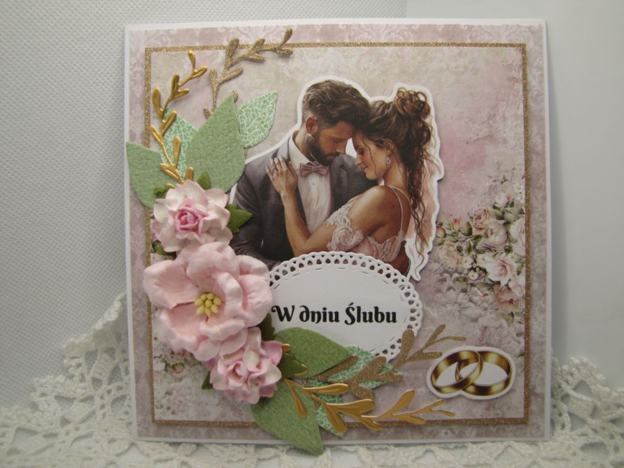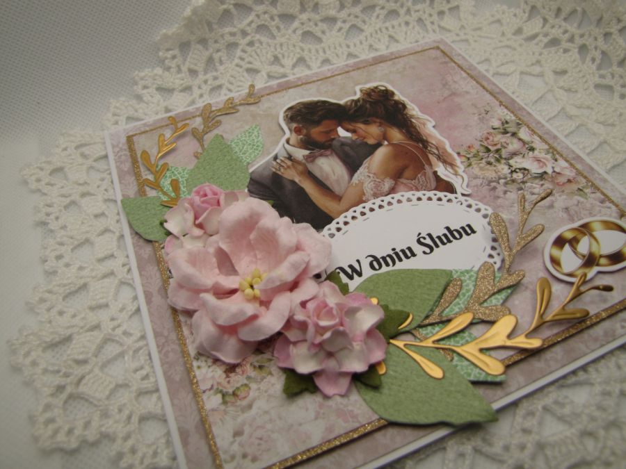 Kartka na uroczystość ślubu utrzymana w tonacji różowej. Całość na białej bazie, po złożeniu14,5x14,5cm. Do wykonania użyłam najwyższej jakości papierów i dodatków. Kartka udekorowana jest wykrojnikowymi elementami, ozdobnym wizerunkiem młodej pary, akcentami złotymi i brokatowymi oraz papierowymi kwiatami w odcieniach różu. Wewnątrz pusta - miejsce na życzenia, jednak na prośbę kupującego mogę kartkę personalizować i wydrukować życzenia. Mogę też dodać kieszonkę/zakładkę na pieniądze. Do kartki dołączone jest białe pudełko z okienkiem, które ładnie eksponuje kartkę. Wymiary pudełka 15x15x2,5cm. Dodatkowo przewiązane jest białą satynową wstążką. Mogę też na pudełku nakleić ozdobny banerek z imionami młodych i datą ślubu - do uzgodnienia.
