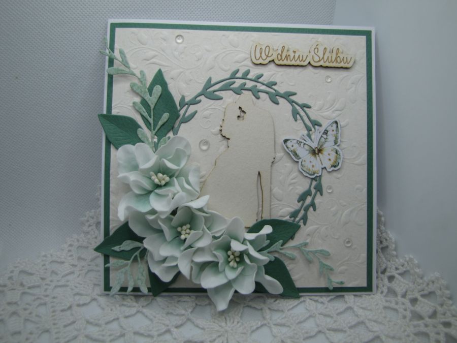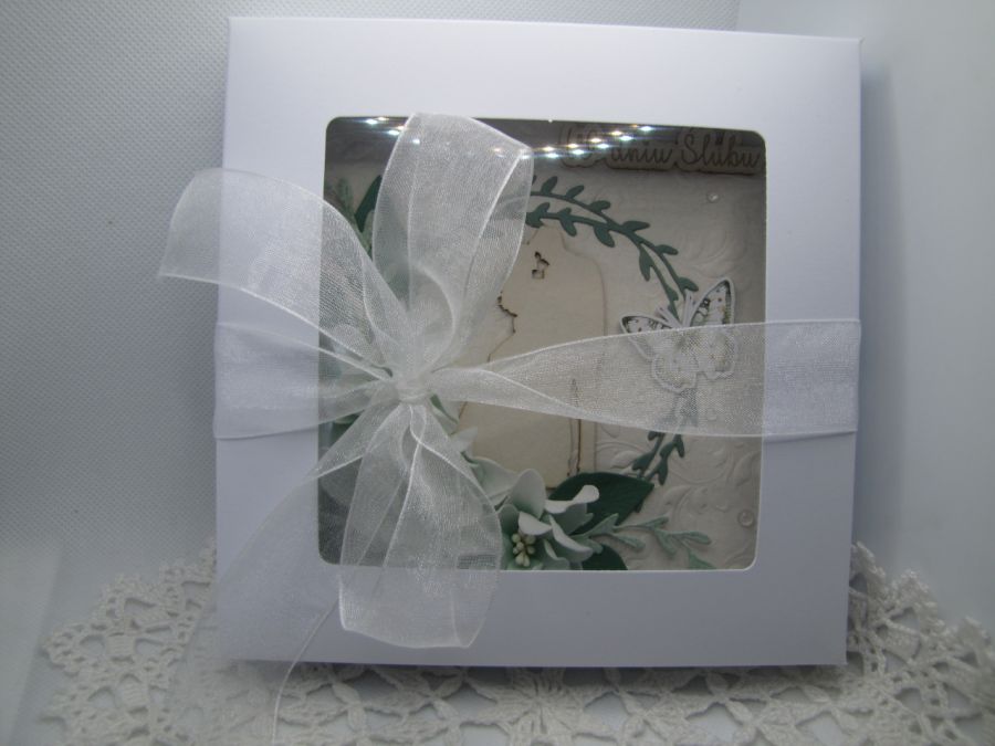 Kartka w odcieniach zieleni z bielą. Wykonana starannie z najwyższej jakości papierów i dodatków. W centrum tekturka Młodej pary otoczona wykrojnikowymi elementami i pięknymi dużymi kwiatami z foamiranu. Całość wykonana na białej bazie 14,5cm x 14,5cm. Umieszczona w pudełku z okienkiem 15x15x2,5cm, przewiązanym szyfonową wstążką. Kartka wewnątrz pusta - miejsce na życzenia, jednak na prośbę kupującego mogę takie życzenia wydrukować i wkleić - do uzgodnienia.