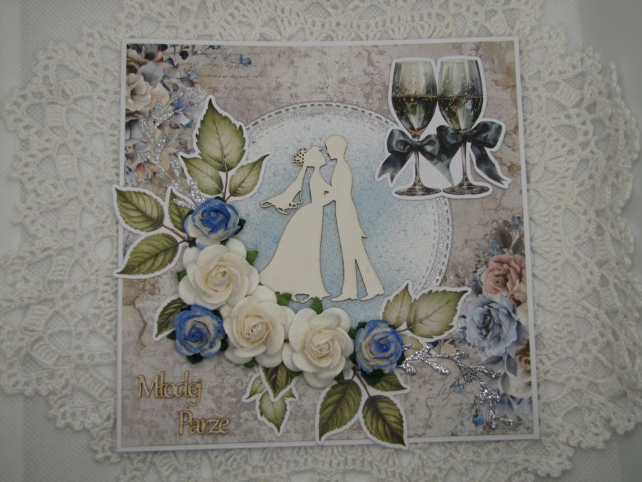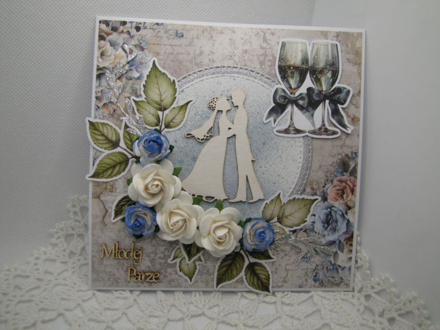 Kartka ślubna w tonacji kawowo - niebieskiej z białymi i srebrnymi akcentami. Wykonana starannie z najwyższej jakości papierów i dodatków. W centrum tekturka młodej pary otoczona wykrojnikowymi elementami i papierowymi kwiatami. Wewnątrz pusta - miejsce na życzenia, jednak na prośbę kupującego mogę kartkę personalizować i wydrukować życzenia. Mogę też dodać kieszonkę/zakładkę na pieniądze. Do kartki dołączone jest pudełko z okienkiem, które ładnie eksponuje kartkę. Wymiary pudełka 15x15x2,5cm. Dodatkowo przewiązane satynową wstążką.