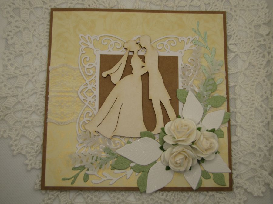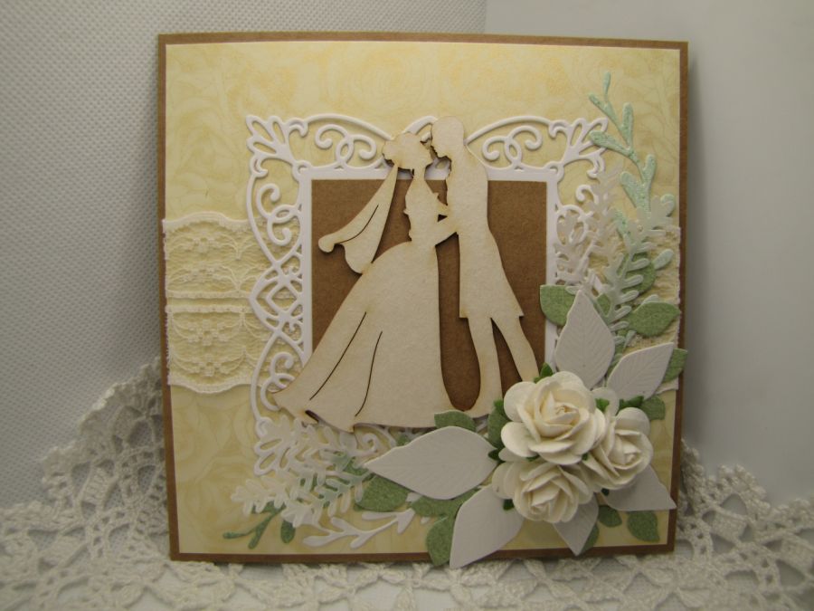 Kartka ślubna w złocisto - beżowej tonacji. Wykonana starannie z najwyższej jakości papierów i dodatków. W centrum tekturka młodej pary otoczona wykrojnikowymi elementami i papierowymi kwiatami. Wewnątrz pusta - miejsce na życzenia, jednak na prośbę kupującego mogę kartkę personalizować i wydrukować życzenia. Mogę też dodać kieszonkę/zakładkę na pieniądze. Do kartki dołączone jest pudełko z okienkiem, które ładnie eksponuje kartkę. Wymiary pudełka 15x15x2,5cm. Dodatkowo przewiązane wstążką i sznureczkiem.