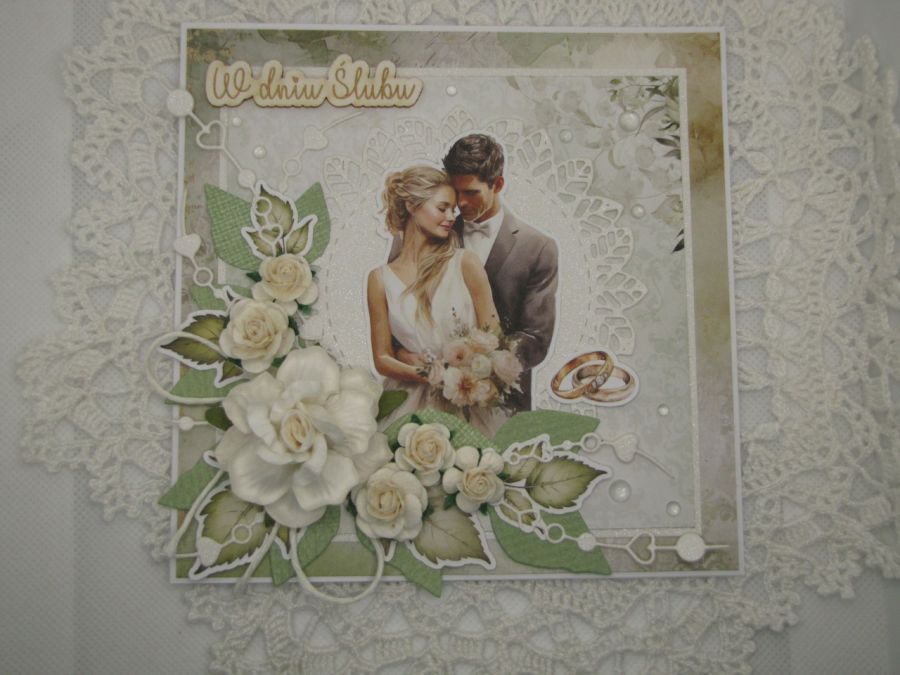 Kartka ślubna w tonacji zielono - białej, z wydrukiem pary młodej. Ozdobiona listkami oraz pasującymi papierowymi różami. Błysku nadaje biały papier brokatowy. Całość wykonana starannie z najwyższej jakości materiałów na bazie białej o wymiarach 14,5x14,5cm. Wewnątrz pusta - miejsce na życzenia, jednak na prośbę kupującego mogę takie życzenia wydrukować i wkleić, mogę też dodać ozdobną zakładkę/kieszonkę na pieniądze- do uzgodnienia. Do kartki dołączone jest pudełko z okienkiem przewiązane szyfonową wstążką. Pudełko 15x15x2,5cm.