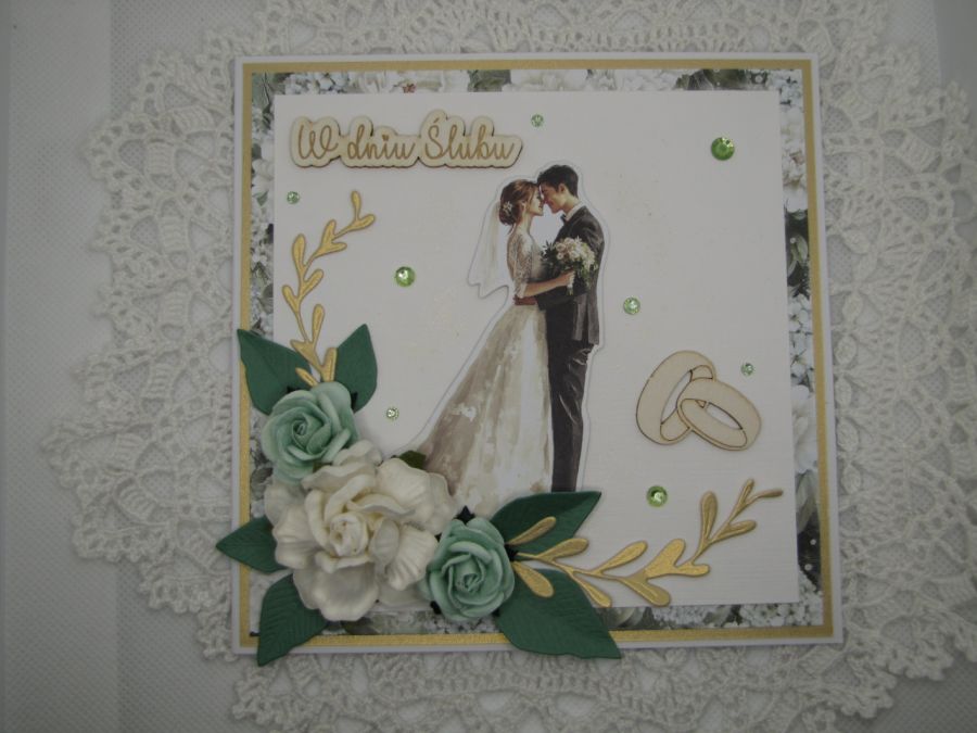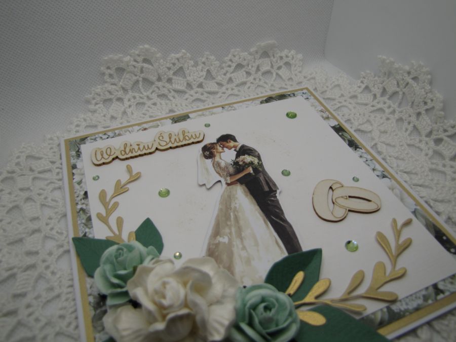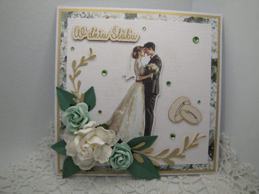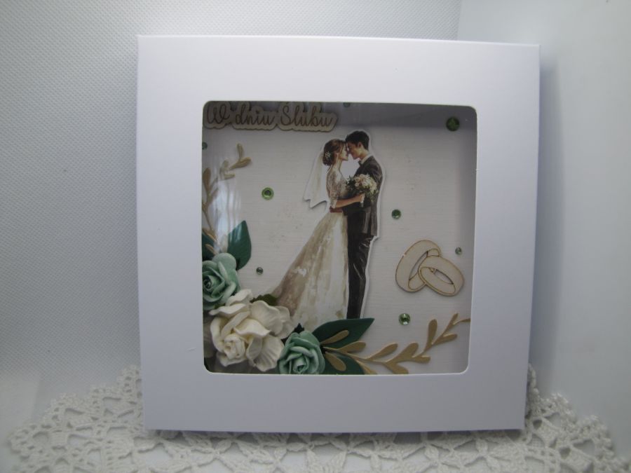 Kartka ślubna w tonacji zielono - białej, z parą młodą w centrum. Ozdobiona zelonymi i złotymi listkami oraz pasującymi papierowymi różami. Błysku nadaje złoty papier i kryształki. Całość wykonana starannie z najwyższej jakości materiałów na bazie białej o wymiarach 14,5x14,5cm. Wewnątrz pusta - miejsce na życzenia, jednak na prośbę kupującego mogę takie życzenia wydrukować i wkleić, mogę też dodać ozdobną zakładkę/kieszonkę na pieniądze- do uzgodnienia. Do kartki dołączone jest pudełko z okienkiem przewiązane szyfonową wstążką. Pudełko 15x15x2,5cm.