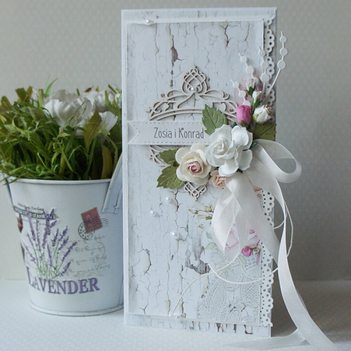 Wykonana z wykorzystaniem profesjonalnych materiałów. Ozdobiona tekturową ramką, bukietem kwiatów, delikatną wstążką oraz perełki.