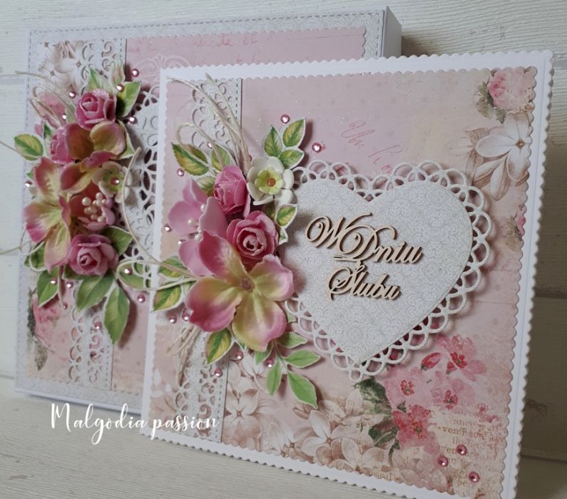 Oryginalny, ręcznie wykonany komplet ślubny - kartka w pudełku w pastelowej różowej kolorystyce. Praca ozdobiona bukietami kwiatów, perełkami i ażurowymi sercami. Wykonana z pięknych, najwyższej jakości papierów z wielką starannością o szczegóły. Wewnątrz kartki ozdobione miejsce na wpis życzeń. Wymiary pudełka 15 na 15 na 2,5 cm, wymiary kartki 14 na 14 cm. Niepowtarzalna pamiątka ślubna 100% hand made, serdecznie zapraszam :)