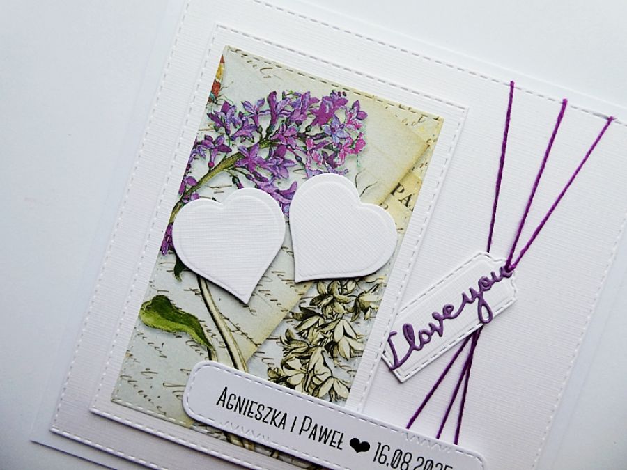 Delikatne tło z odręcznym pismem, czarno-beżowe kwiatowe ryciny i jeden, wyrazisty akcent: fiołkowy kwiat, a do tego – dwa białe serca, ozdobny sznurek i tag z prostym przesłaniem: I LOVE YOU.