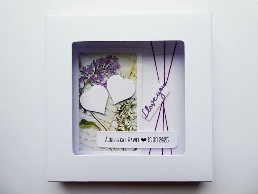 W komplecie jest białe gustowne pudełko z szybką - dzięki niemu kartka jest gotowa do wręczenia, a później przechowywania przez długie lata.