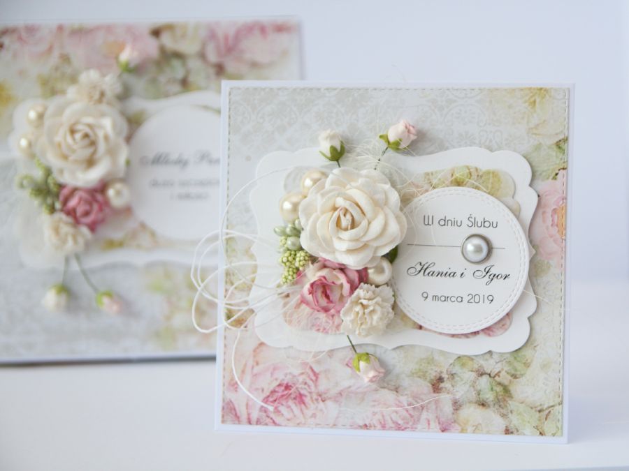 Kartka na przodzie ozdobiona papierem scrapbookingowym z kompozycją z kwiatuszków oraz kołem z personalizacją - uwaga w kole zapis - z okazji ślubu i imiona i data ślubu - ew, inny napis,