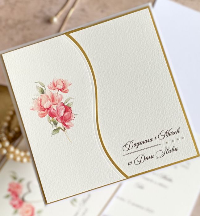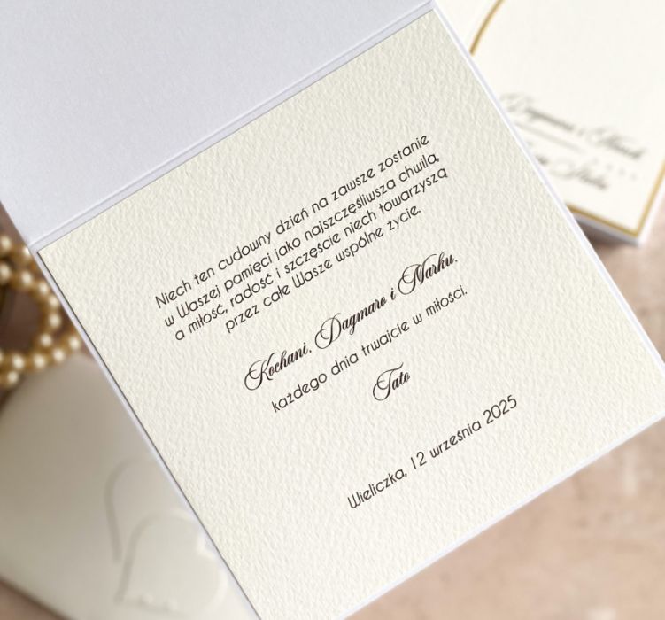 To zestawienie wyjątkowego włoskiego papieru w odcieniu delikatnej, śmietankowej bieli oraz wykończeń w odcieniu matowego złota. Ozdobionych ręcznie wyciętymi elementami z dodatkiem alabastrowych perełek lub delikatnych cyrkonii.