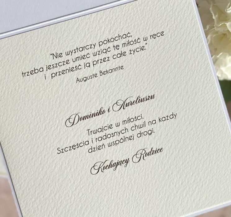 Linia Pastelle naszych projektów ślubnych to niezwykle subtelne połączenia autorskich projektów graficznych w delikatnych, pastelowych tonacjach. To zestawienie wyjątkowego włoskiego papieru w odcieniu delikatnej, śmietankowej bieli oraz wykończeń w odcieniu ecru. Ozdobionych ręcznie wyciętymi elementami z dodatkiem alabastrowych perełek lub delikatnych cyrkonii.