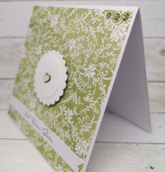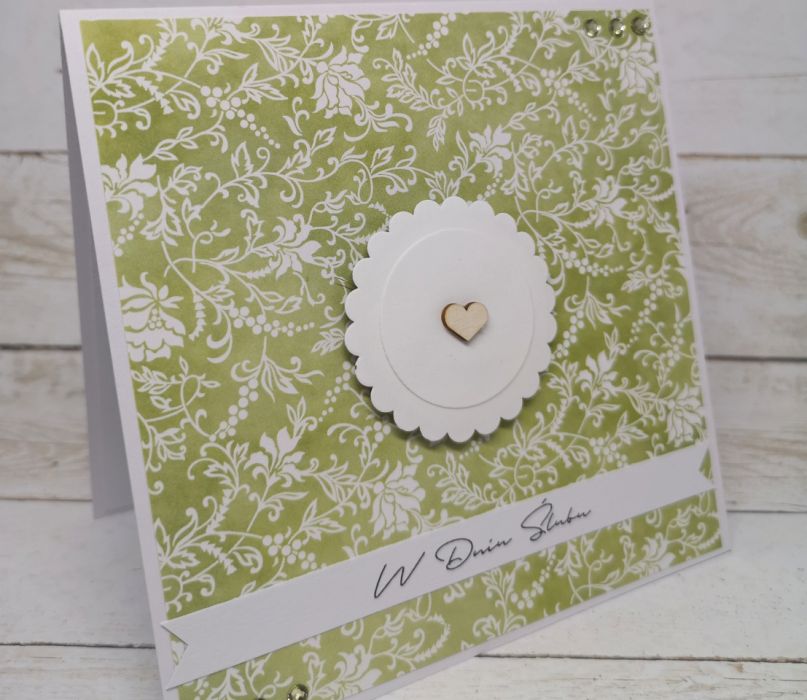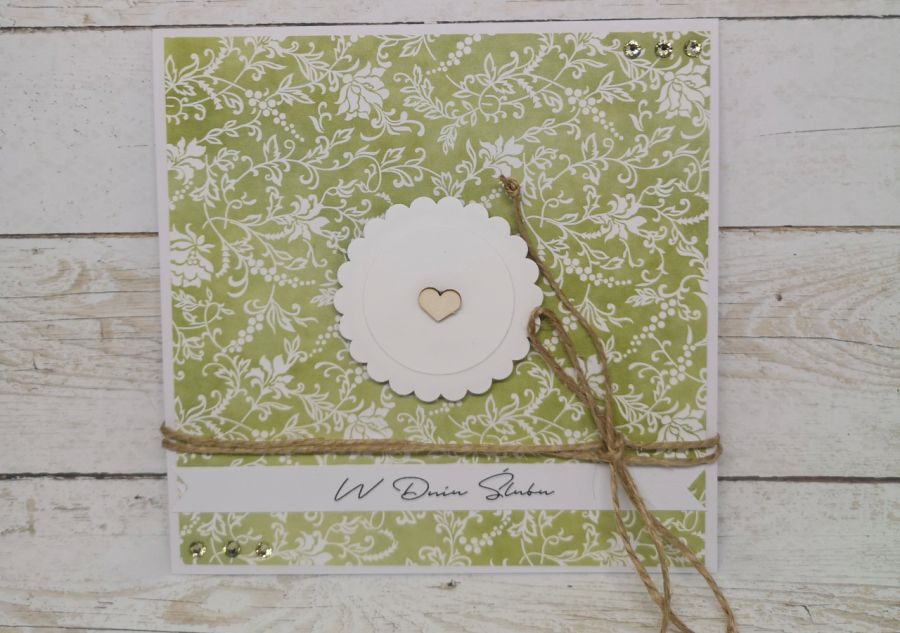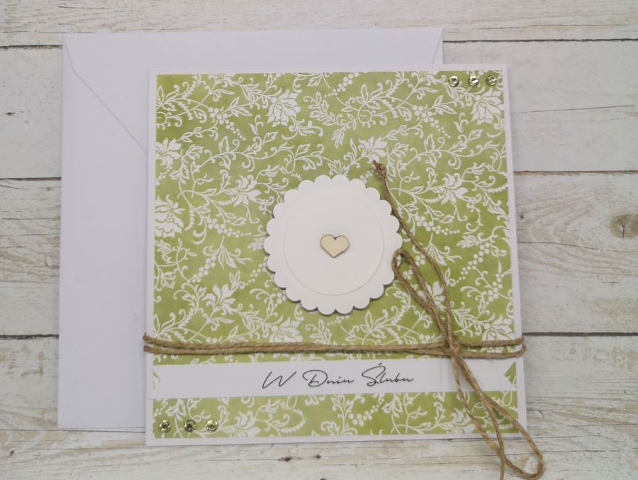Kartka z okazji ślubu, utrzymana w delikatnej, seledynowej kolorystyce z dodatkiem bieli. Wewnatrz pusta, do samodzielnego zapisania.