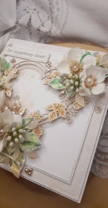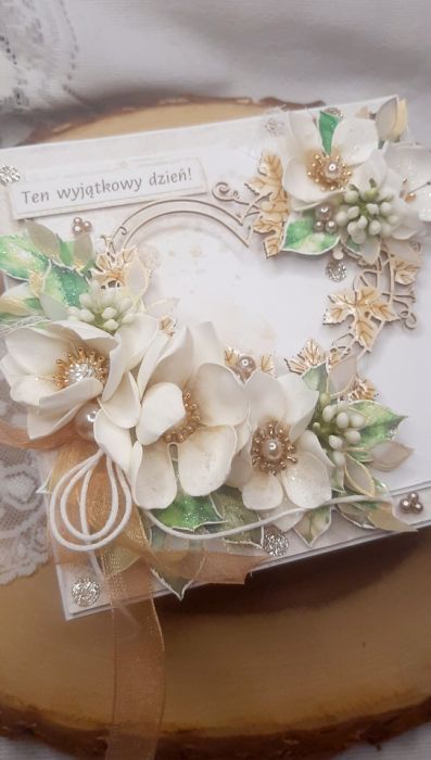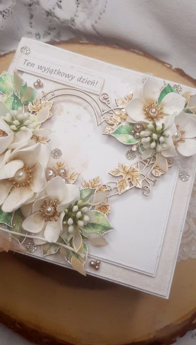 Kartka okolicznościowa do pudełka. Kartka jest bogato zdobiona kwiatami i innymi dodatkami. W środku kartka na życzenia podklejona taśmą dwustronną. Wymiary kartki 14x14 cm. W zestawie z pudełkiem o wymiarach 14,5x14x5x3 cm.