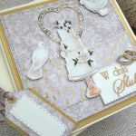 Kartka jest utrzymana odcieniach jasnego fioletu, złota i bieli, a jej elementem głównym jest tort ślubny. Wyróżnia się detalem z papieru pergaminowego ze złotym nadrukiem, a także elementem ze złotego metalizowanego papieru z delikatnym połyskiem, które nadają jej elegancki charakter. Napis jest wykonany metodą embossingu na gorąco. Kartka została także wykończona preparatem „glossy accents”, który po wyschnięciu jest przezroczysty i nadaje posmarowanym nim elementom delikatny połysk.