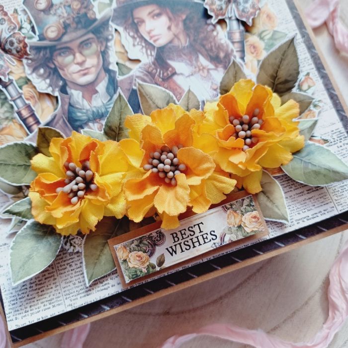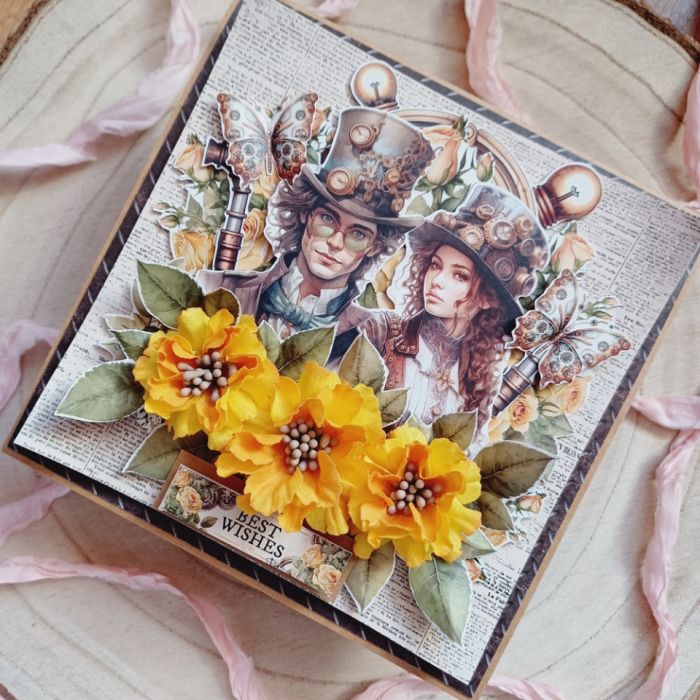 Niezwykła, bogato zdobiona kartka okolicznościowa w klimacie steampunkowym. Projekt łączy motywy mechaniczne i wiktoriańskie z energetycznymi, żółtymi kwiatami oraz wizerunkiem pary w stylowych nakryciach głowy. Idealny wybór dla osób szukających czegoś nieszablonowego na urodziny, jubileusz czy jako wyraz uznania dla fana fantastyki.