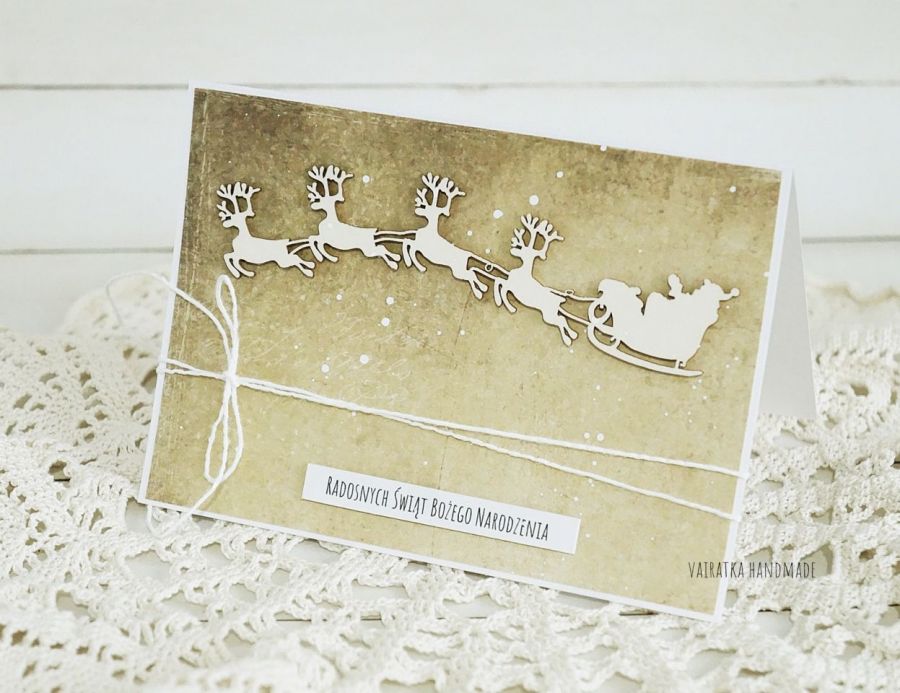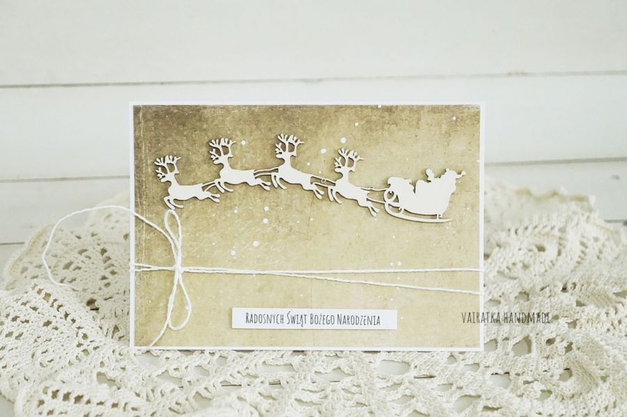 Kartka świąteczna w stylu eco, ozdobiona lnianym sznurkiem, zaprzęgiem Mikołaja z tektury, chlapaniami farbą akrylową. Rozmiar 10,5x15cm (C6), w komplecie z kopertą. Cena dotyczy jednej sztuki