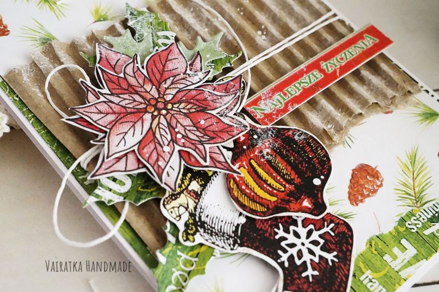 Kartka świąteczna ozdobiona wielowarstwową kompozycją z papierowych elementów (kwiaty i liście) oraz tekturki. Poszczególne elementy podklejone kosteczkami 3d.