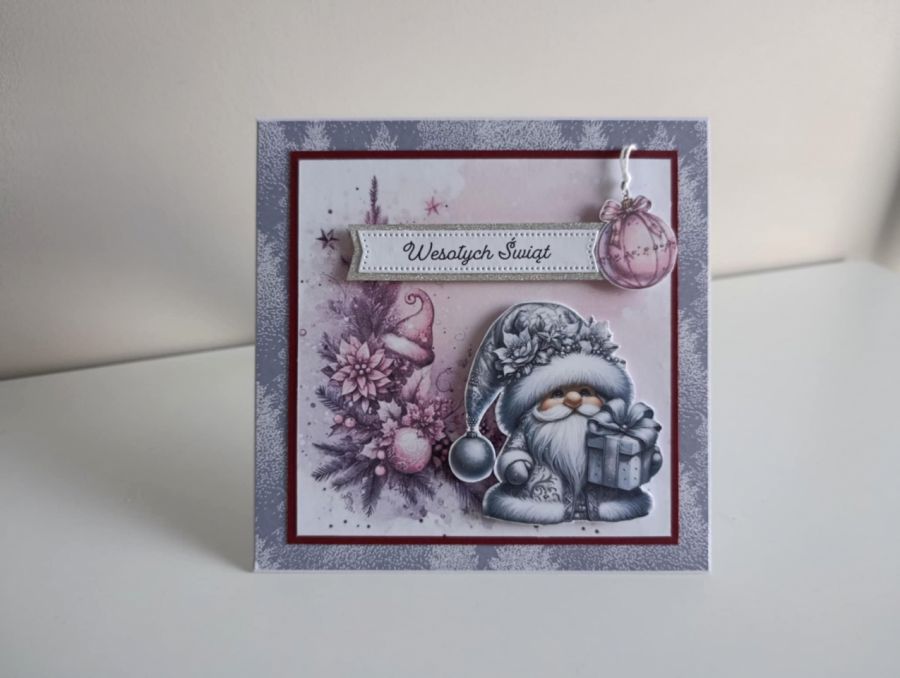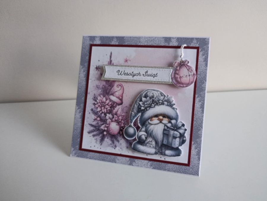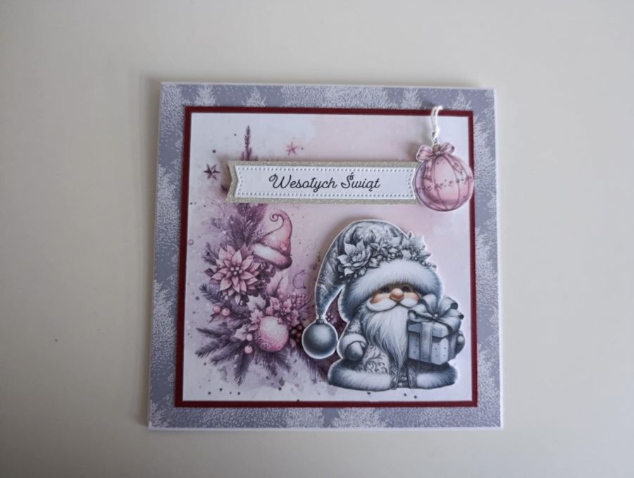 Zadaj pytanie dotyczące produktu: Kartka świąteczna Boże Naordzenie różowa skrzat