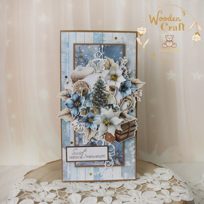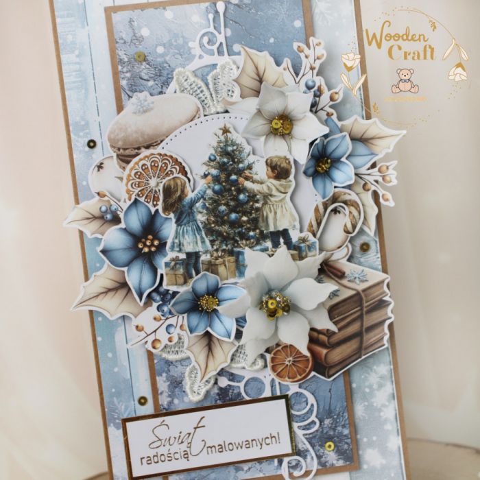 Przepiękna, bogato zdobiona kartka na Boże Narodzenie z motywem dzieci dekorujących choinkę. Kartka wykonana ręcznie, techniką scrapbookingu, z dbałością o każdy szczegół, z najnowszej kolekcji papierów "Jolly Season". Kartka ozdobiona kwiatowymi grafikami oraz ręcznie wykonanymi ponsecjami, udekorowana połyskującymi złotymi cekinami oraz napisem "Świąt radością malowanych". Elementy są klejone warstwowo, dzięki czemu kartka daje lekki efekt 3D,