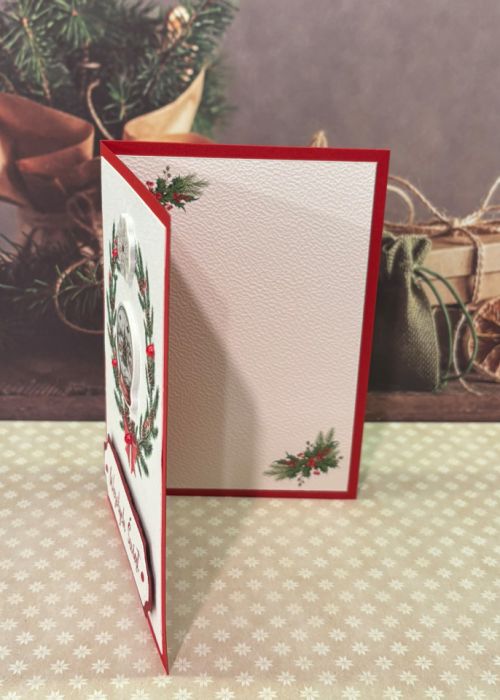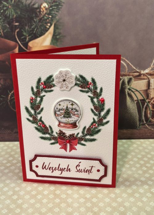 Elegancka, ręcznie wykonana kartka bożonarodzeniowa utrzymana w klasycznej świątecznej kolorystyce. Centralnym elementem jest piękny świąteczny wieniec z gałązek świerku, zdobiony szyszkami oraz czerwonymi dekoracjami. W jego środku znajduje się trójwymiarowa ilustracja śnieżnej kuli z zimowym miasteczkiem, która dodaje kartce wyjątkowego uroku.