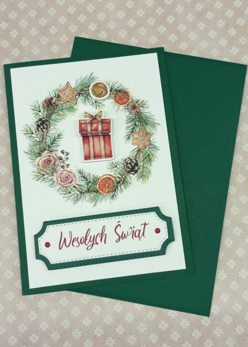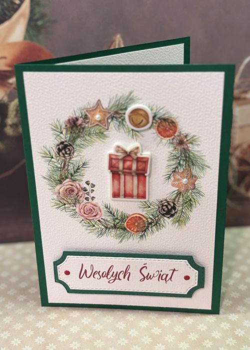 Wyjątkowa, ręcznie wykonana kartka bożonarodzeniowa utrzymana w eleganckiej, naturalnej stylistyce. Jej centralnym elementem jest piękny świąteczny wieniec z gałązek sosny, szyszek, suszonych pomarańczy, gwiazdeczek i subtelnych ozdobnych róż. W środku znajduje się trójwymiarowa ilustracja świątecznego prezentu przewiązanego kokardą, która nadaje kartce wyjątkowego, ciepłego charakteru.