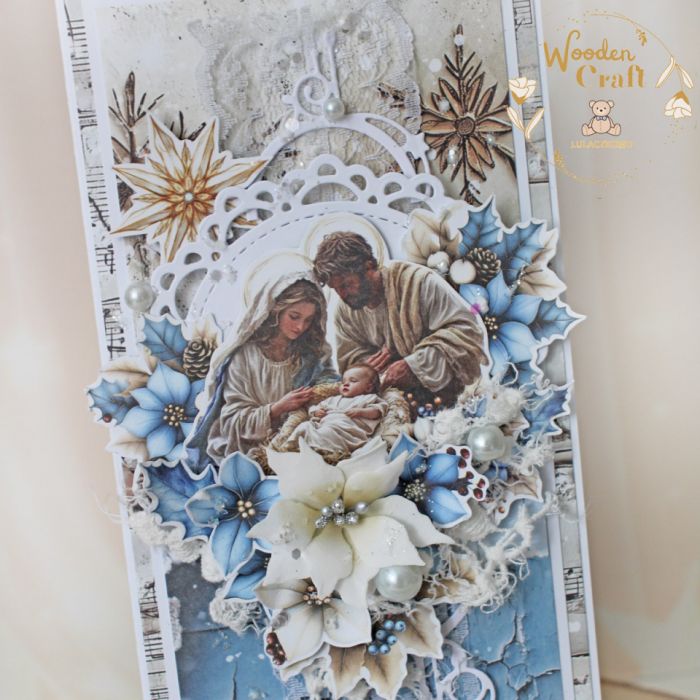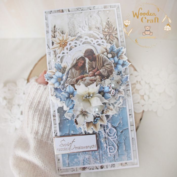 Przepiękna, bogato zdobiona kartka na Boże Narodzenie z motywem Świętej Rodziny.