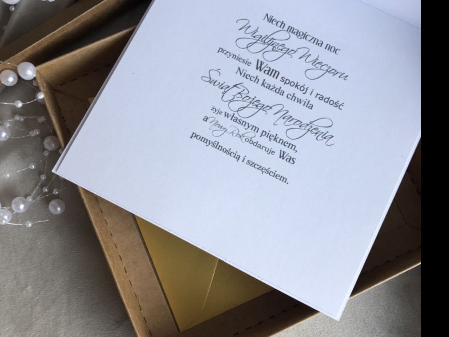 Wnętrze kartki: gotowe życzenia świąteczne.